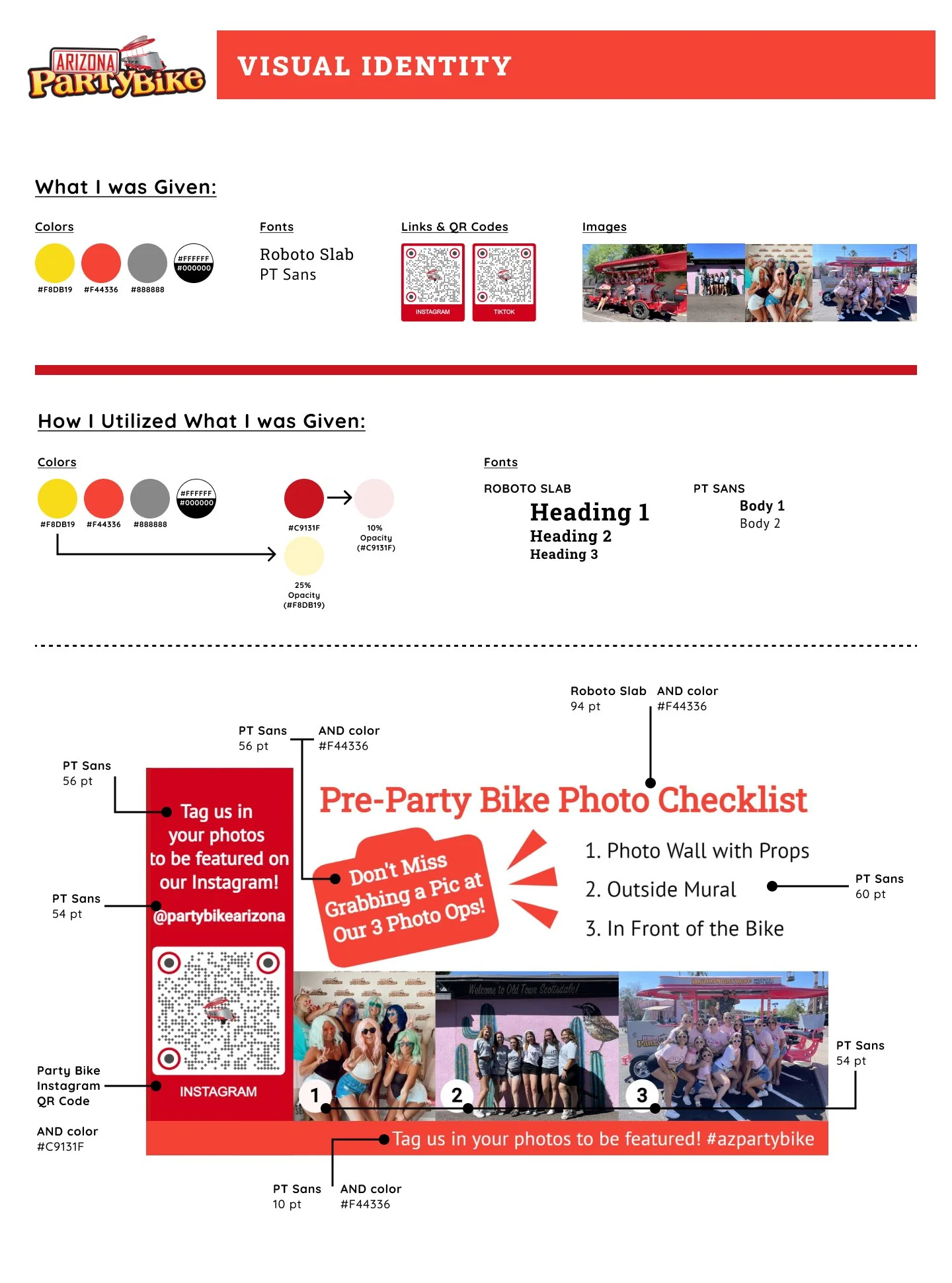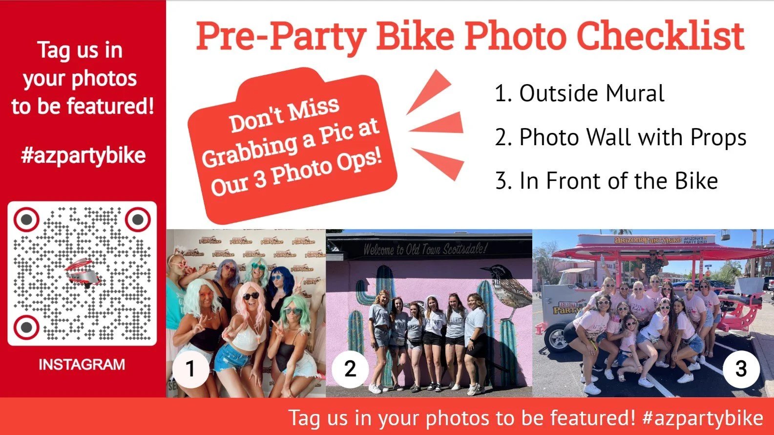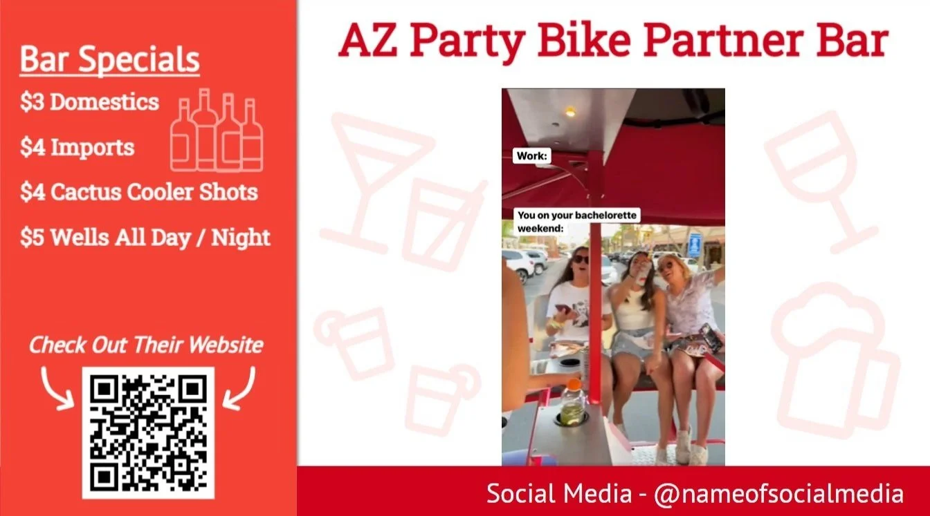 For the design I added a border with a QR code to the Arizona Party Bike’s instagram. I made the border dark red to stand out and break up the slide into sections. I added a camera icon to emphasize and visually represent the photo opportunities. Once again I added a scrolling text at the bottom to remind guests to tag the Arizona Party Bike in their photos